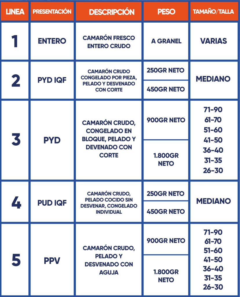 A continuación, detallamos la versatilidad de nuestro catálogo de presentaciones de camarones, todas respaldadas por la calidad inquebrantable de Terranova.